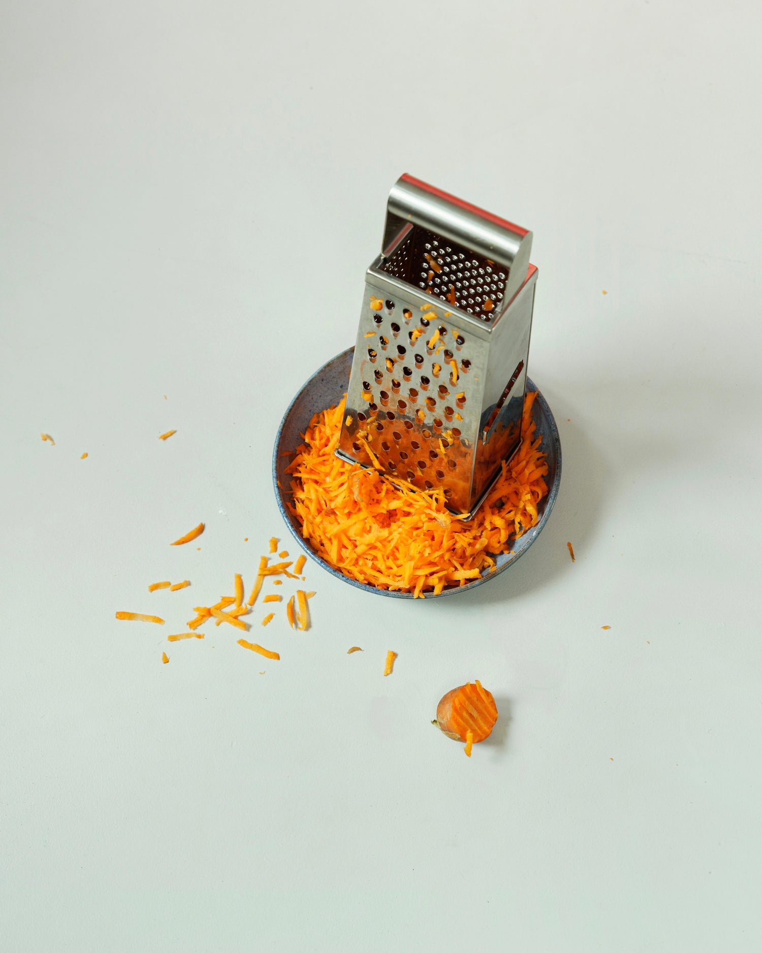 Wasch die 1 Karotte und reibe sie grob auf einen Teller.