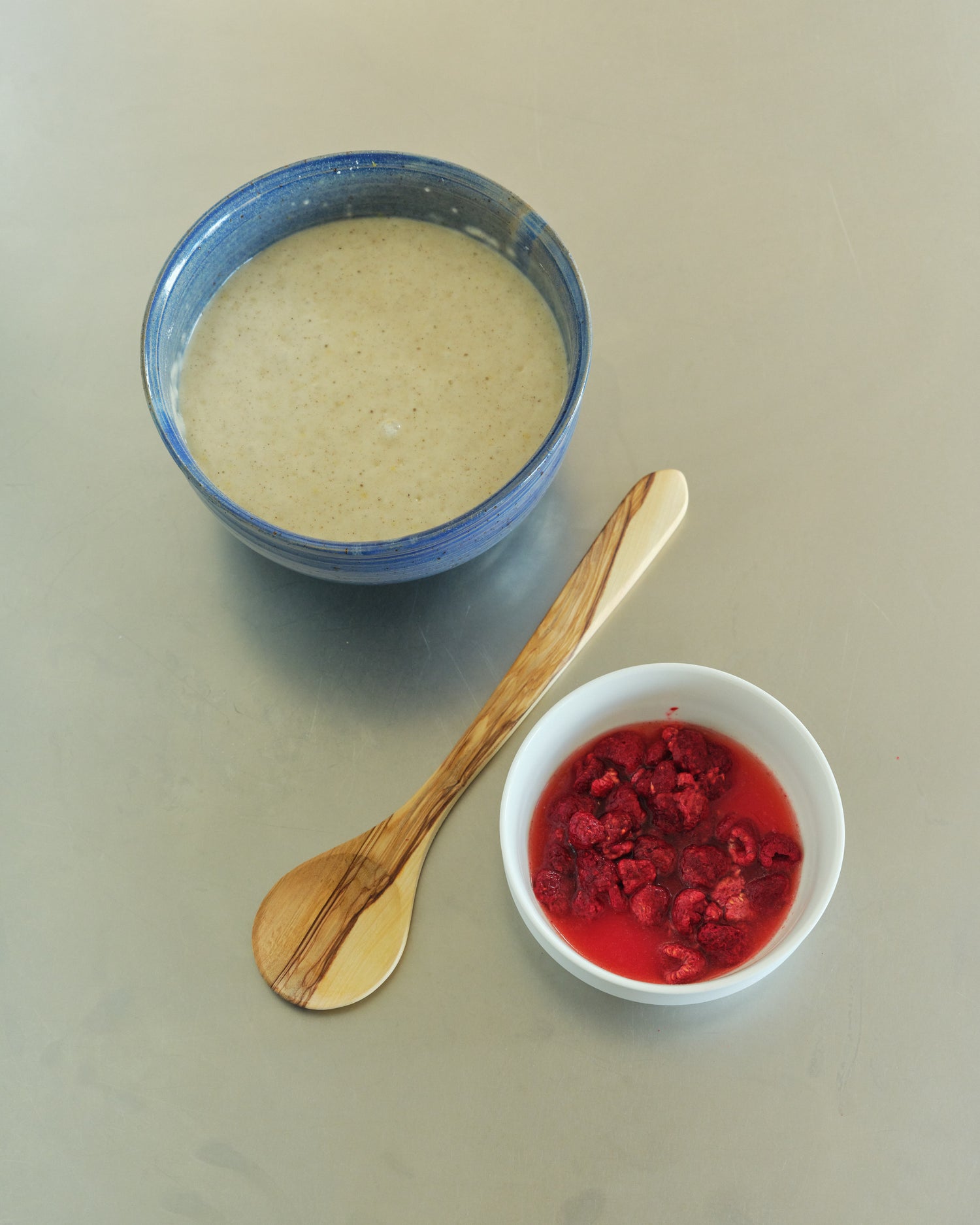 Gieß das übrige Wasser der Himbeeren ab, damit der Teig nicht zu feucht wird. Hebe die eingeweichten Himbeeren mit einem Löffel sanft unter.